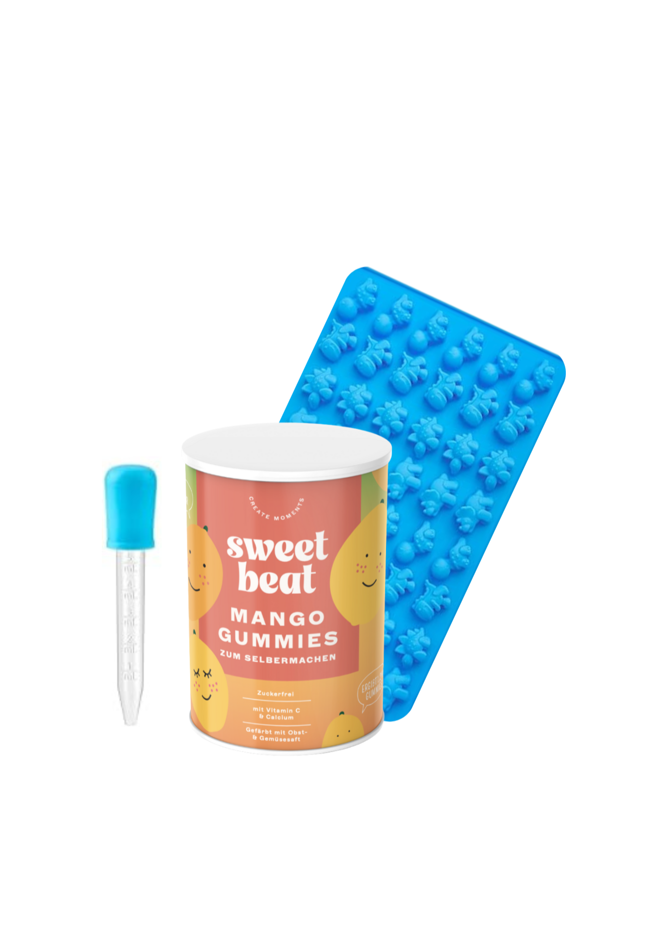 Unser Dino World Set enthält eine Dose Instant Fruchtgummi Mix Mango, eine Dino-Silikonform, sowie eine Pipette.