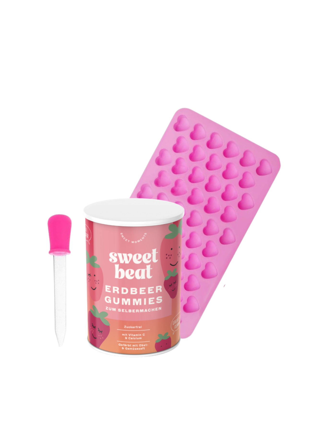 Unser Love Is In The Air Set enthält eine Dose Instant Fruchtgummi Mix Erdbeer, eine Herzchen-Silikonform, sowie eine Pipette.